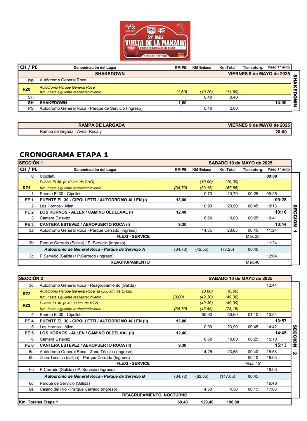 La competencia se pone en marcha el día sábado desde Cipolletti a las 9:00 hs, con la disputa de tres tramos que se repetirán por la tarde: PE1/4: Puente El 30 - Cipolletti / Autódromo Allen (13,00 km), PE2/5: Los Hornos - Allen / Camino Oldelval (12,40 km) y PE3/6: Cantera Estevez - Aeropuerto Roca (9,30 km).