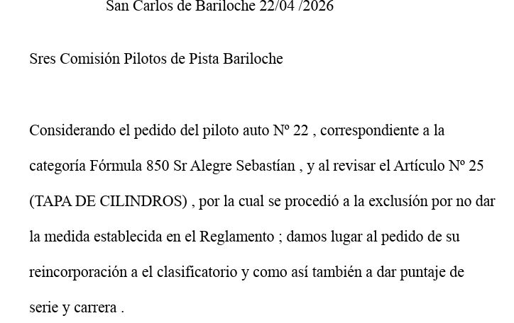 COMPARTIMOS EL INFORME OFICIAL DE LAS RAZONES POR LAS QUE SE TOMÓ EN CONSIDERACIÓN LA APELACIÓN DEL PILOTO SEBASTIÁN ALEGRE: