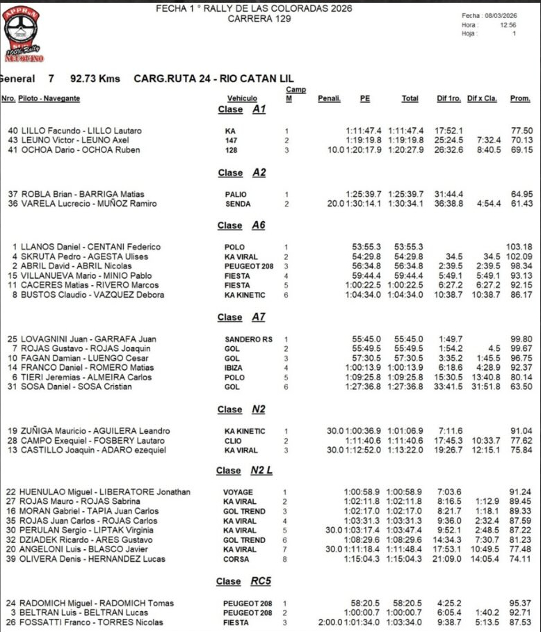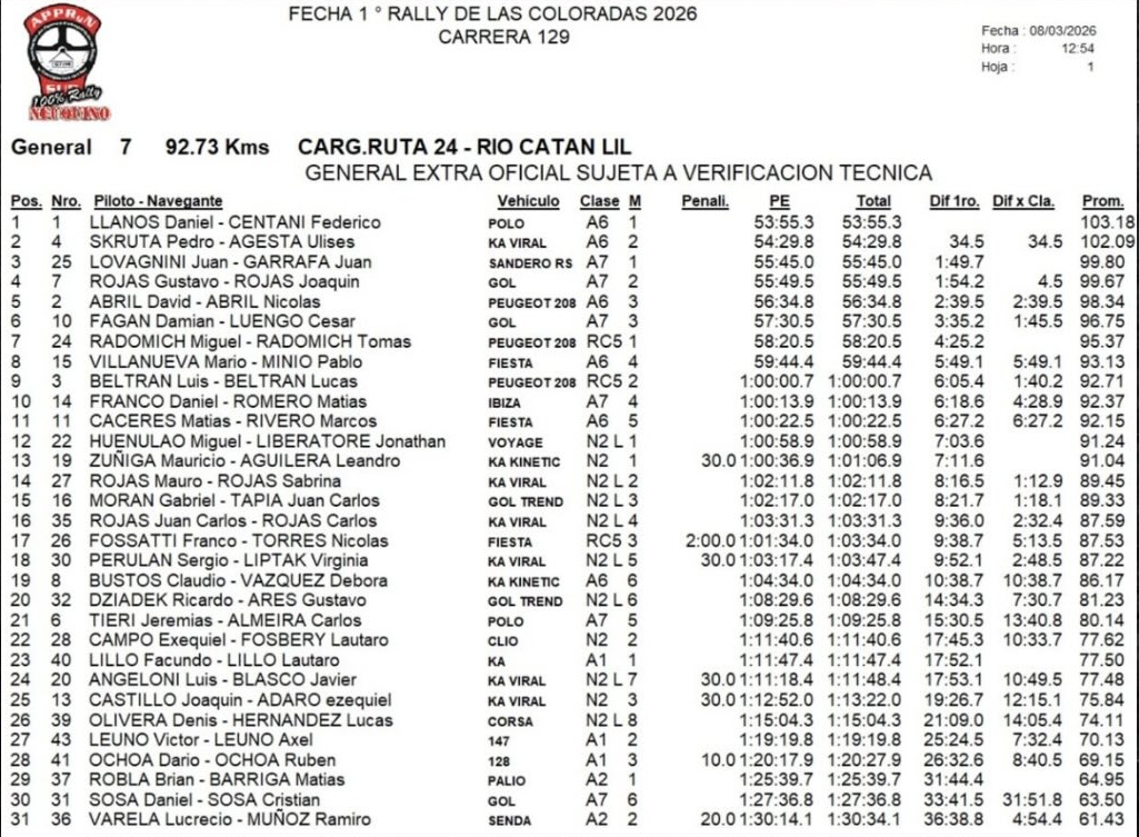 RESULTADOS FINALES - RALLY DE LAS COLORADAS - FECHA 1 DEL NEUQUINO: