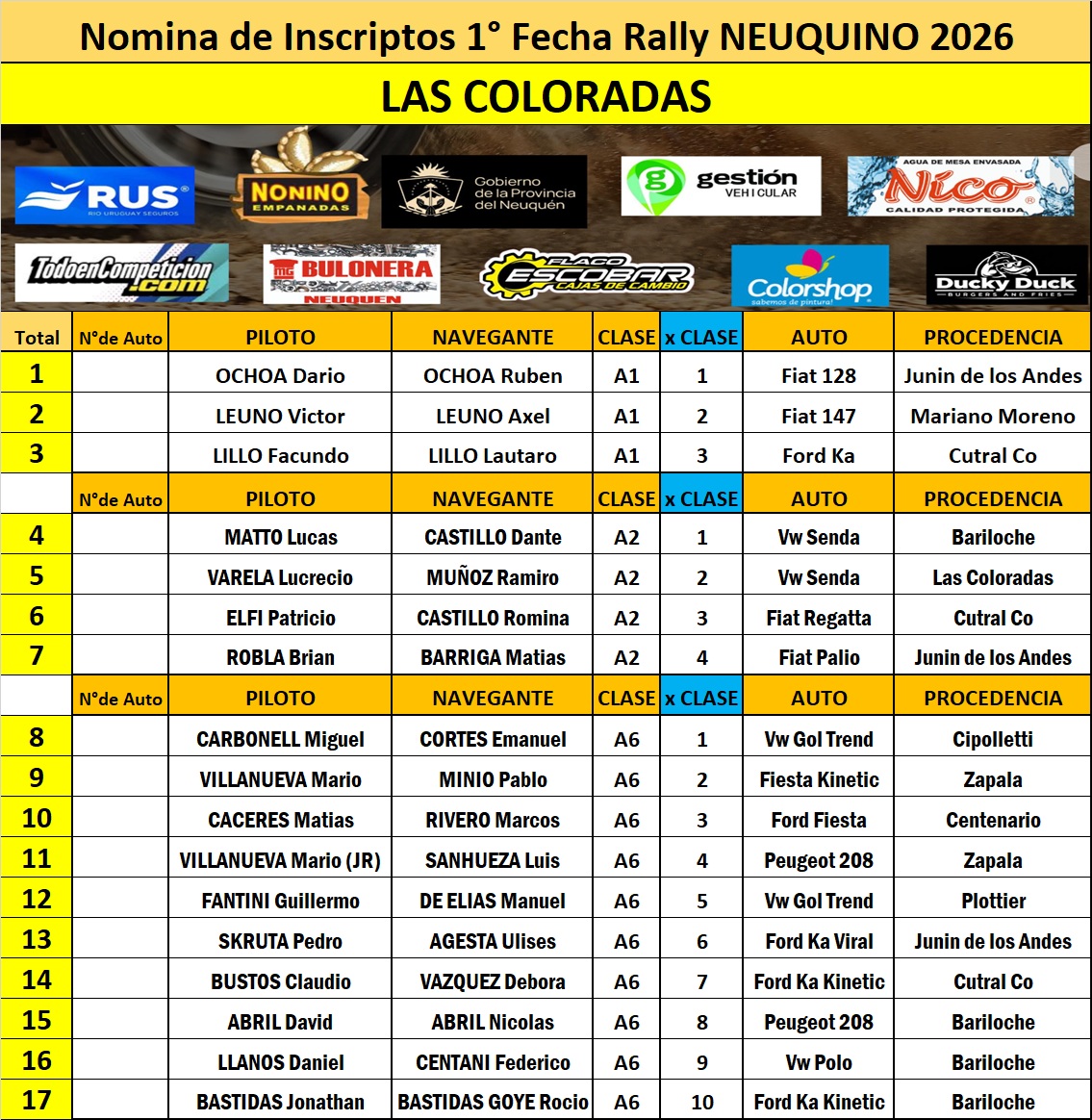 Este martes por la tarde se cerró el registro de anotados para la primera fecha del Rally Neuquino 2026 que se llevará a cabo del 6 al 8 de marzo en Las Coloradas en el marco de los festejos por un nuevo aniversario de esa ciudad que está cumpliendo 100 años, localidad que está distante a unos 260 kilómetros de Bariloche.