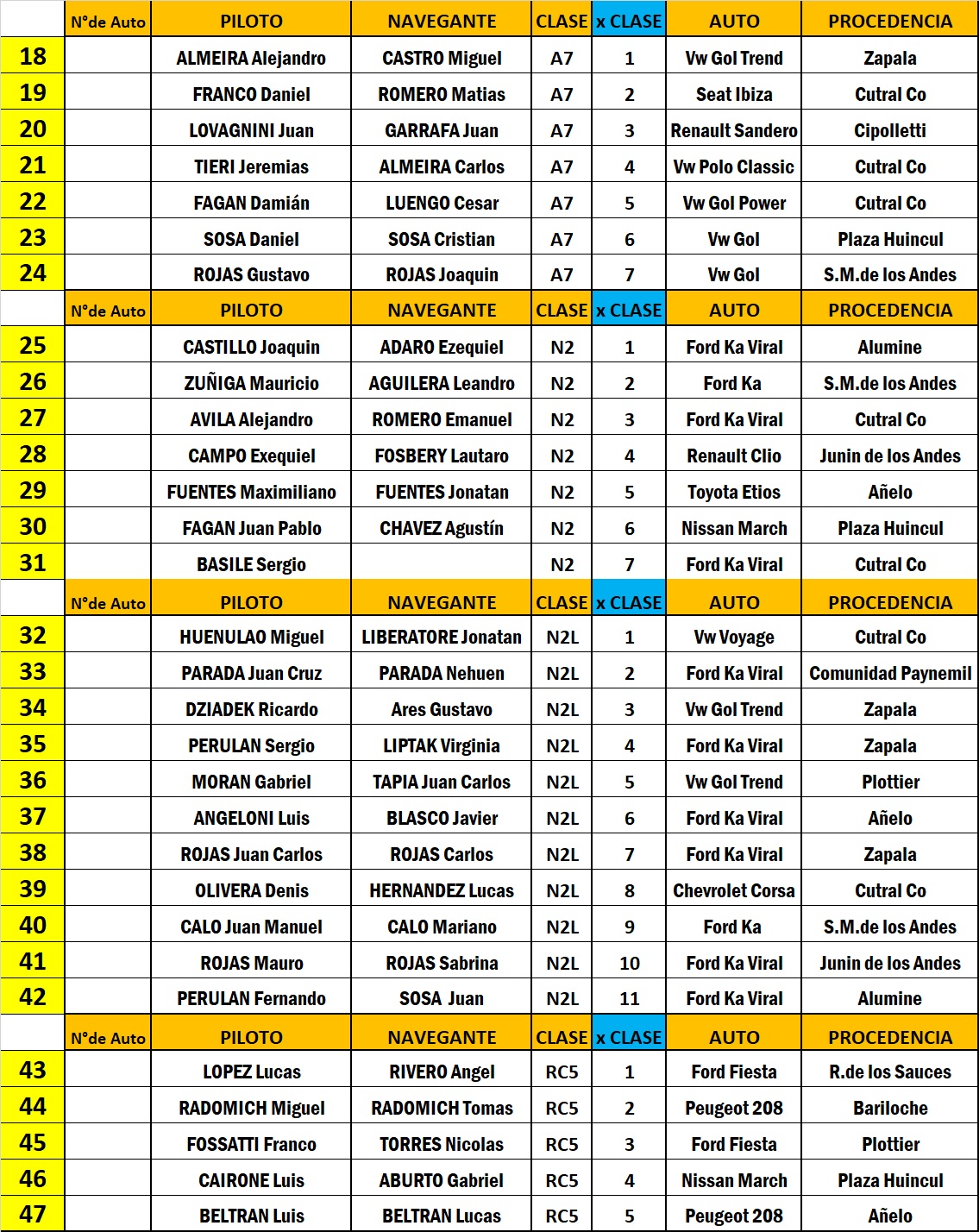 Cinco binomios serán de Bariloche, ya que en la nueva Clase A2 estarán Lucas Matto – Dante Castillo con el Volkswagen Senda, mientras que en la A6 se da la mayor cantidad de presencias barilochenses ya que estarán los bicampeones Daniel Llanos y su navegante Federico Centani con el Volkswagen Polo, los hermanos David y Nicolás Abril con el Peugeot 208 y Jonathan y Rocío Bastidas con el Ford Ka Kinetic.