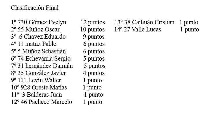 Por ende, el podio de la fecha de la TN 1100 cambió absolutamente, con los pilotos que habían finalizado en pista en los últimos lugares, heredando las primeras posiciones. Fue triunfo para Evelyn Gómez, segundo quedó Oscar Muñoz y tercero Damián Hernández.
