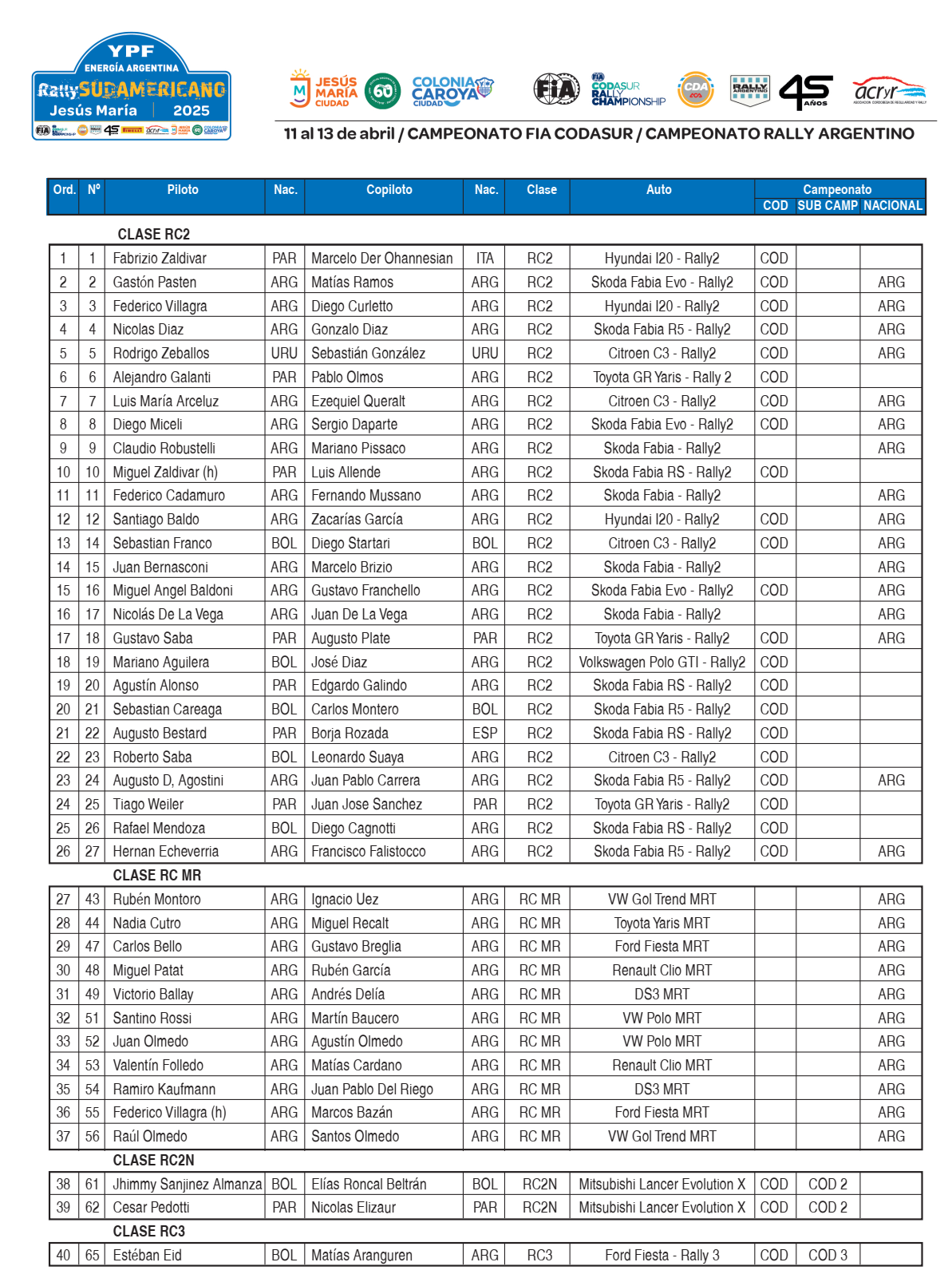 Ente los 81 binomios inscriptos, se destaca la notable presencia de los 26 autos en la clase RC2 en donde se verá un gran duelo de campeones. En Jesús María estarán presentes el campeón CODASUR y vencedor 2024 de esta carrera, Fau Zaldivar-Marcelo Der Ohannesian (Hyundai I20 Rally2); el actual campeón argentino Nico Díaz-Gonzalo Díaz (Skoda Fabia R5 Rally2); el campeón paraguayo Agustin Alonso-Edgardo Galindo (Skoda Fabia RS Rally2); el campeón boliviano Mariano Aguilera-José Diaz (Volkswagen Polo GTI Rally2) y el piloto local y campeón del Rally Cordobés, Santiago Baldo-Zacarías García (Hyundai I20 Rally2).