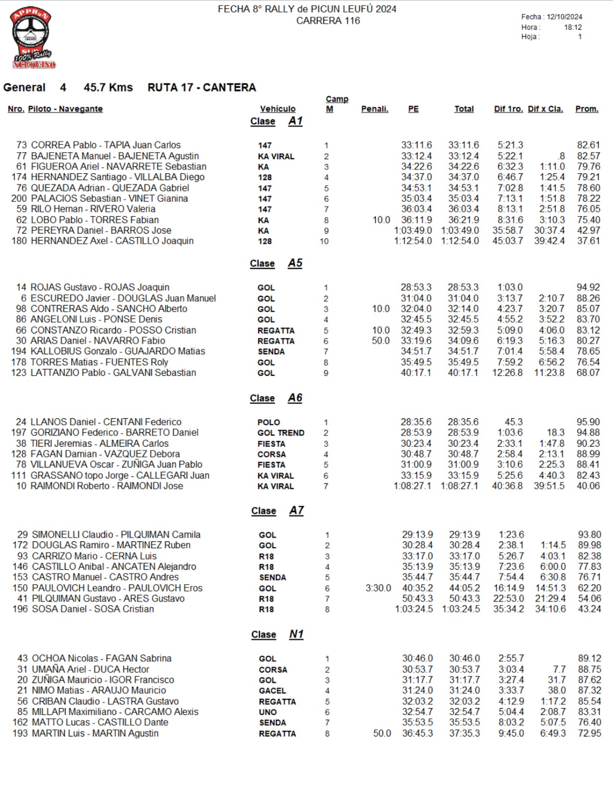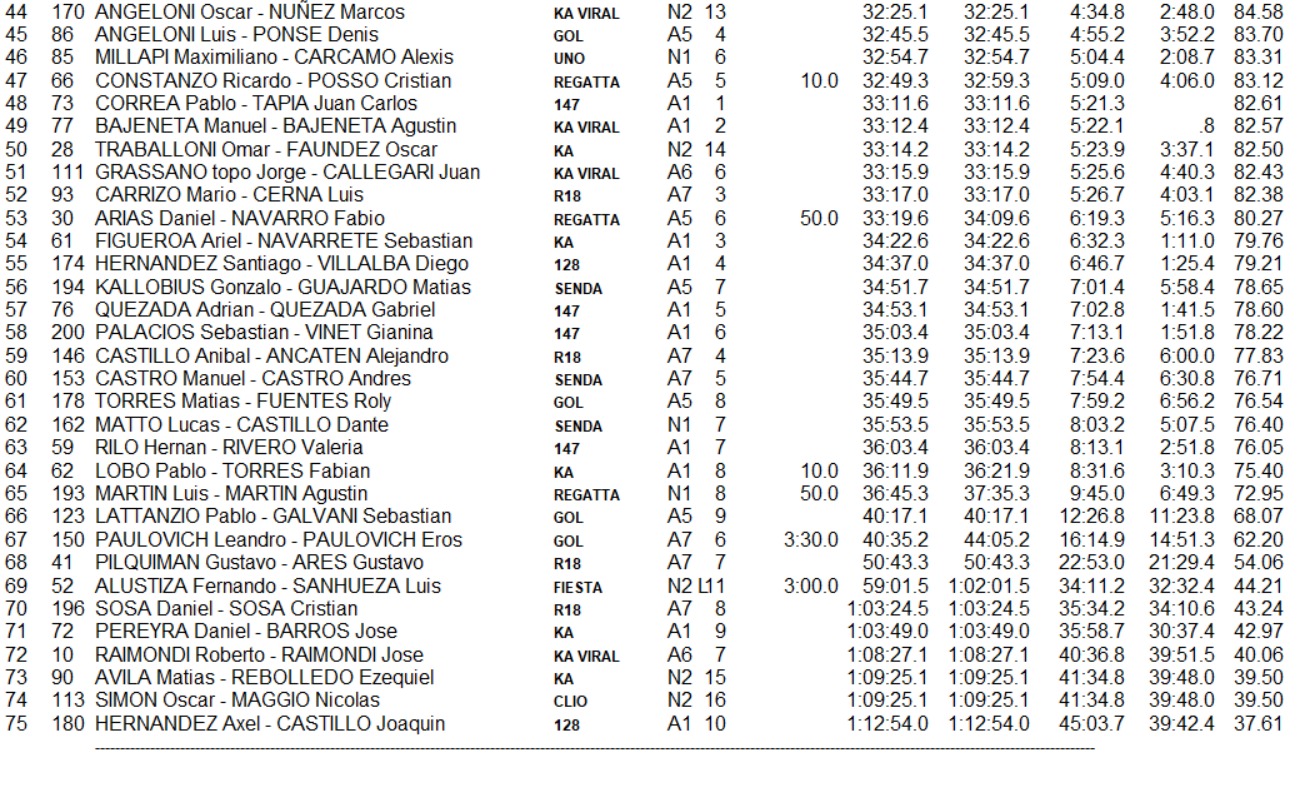 Completan las posiciones de los barilochenses en la primera etapa: Maxi Millapi – Alexis Cárcamo 46º en la General y sextos en la N1, Matías Torres – Roly Fuentes 61º en la General y octavos en la A5, Lucas Matto – Dante Castillo 62º en la General y séptimos en la N1, Pablo Lattanzio – Sebastián Galvani 66º en la General y novenos en la A5 y Oscar Simón – Nicolás Maggio (que representan también a Comallo) con el puesto 74º en la General y 16º en la Clase N2.