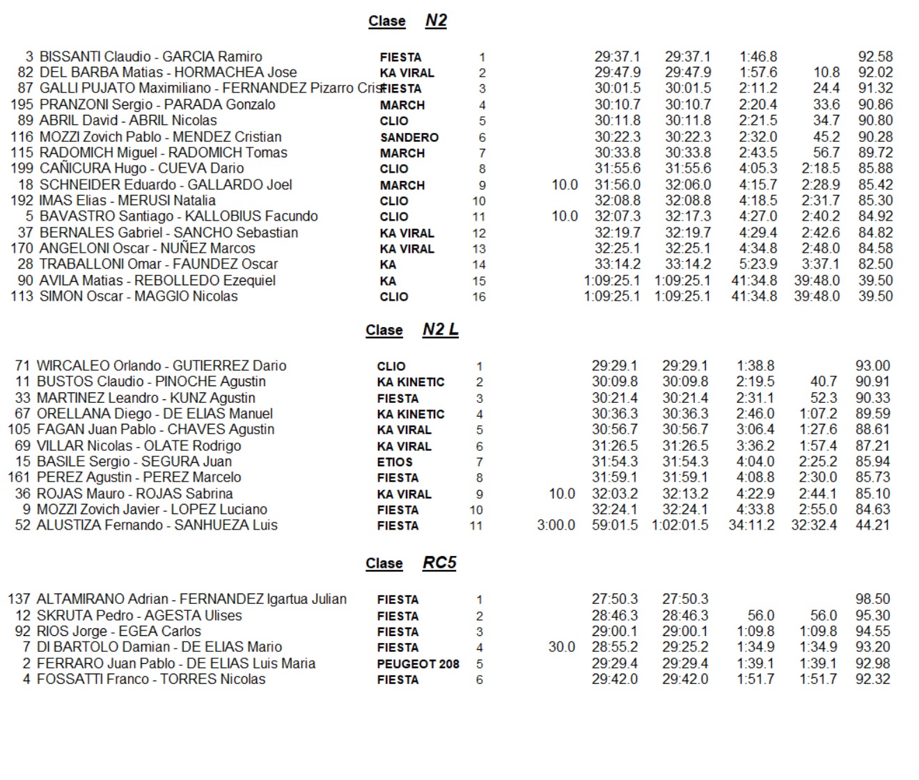 Más abajo se ubicaron David y Nicolás Abril, en el puesto 17º de la general y quintos en la N2, Ramiro Douglas – Rubén Martínez 21º en la General y segundos en la Clase A7, Miguel y Tomás Radomich 22º en la Gral y séptimos en la N2, en el retorno del Nissan March; Puesto 29º en la General y segundo en la Clase A5 para Javier Escuredo – Juan Manuel Douglas, mientras que Santiago Bavastro – Facundo Kallobius terminaron 41º en la General y undécimos en la N2.