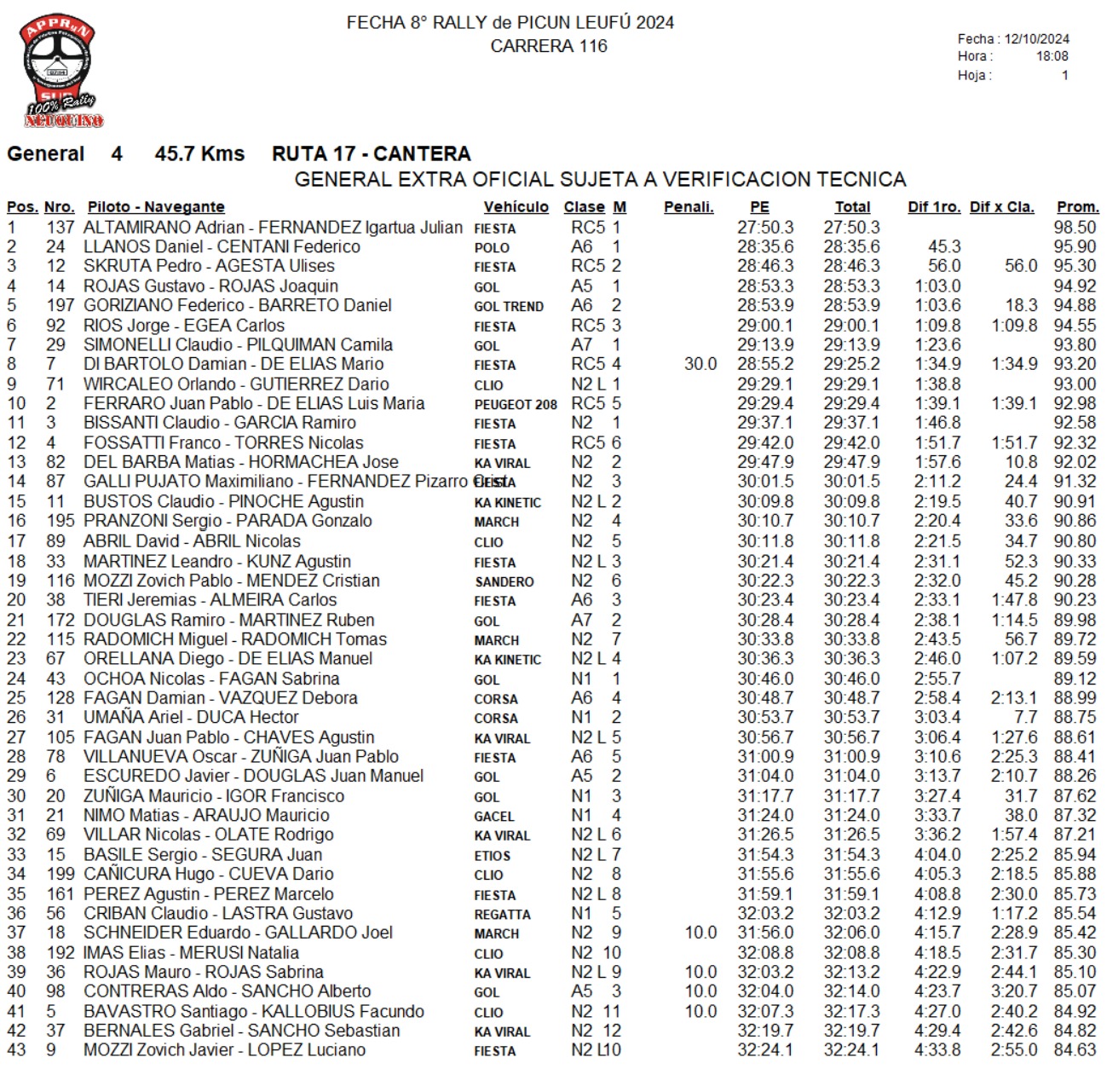 Con 75 autos se completó este sábado la primera etapa de la octava fecha del Rally Neuquino y Llanos con un segundo puesto en la General es el mejor ubicado de Bariloche hasta el momento.
