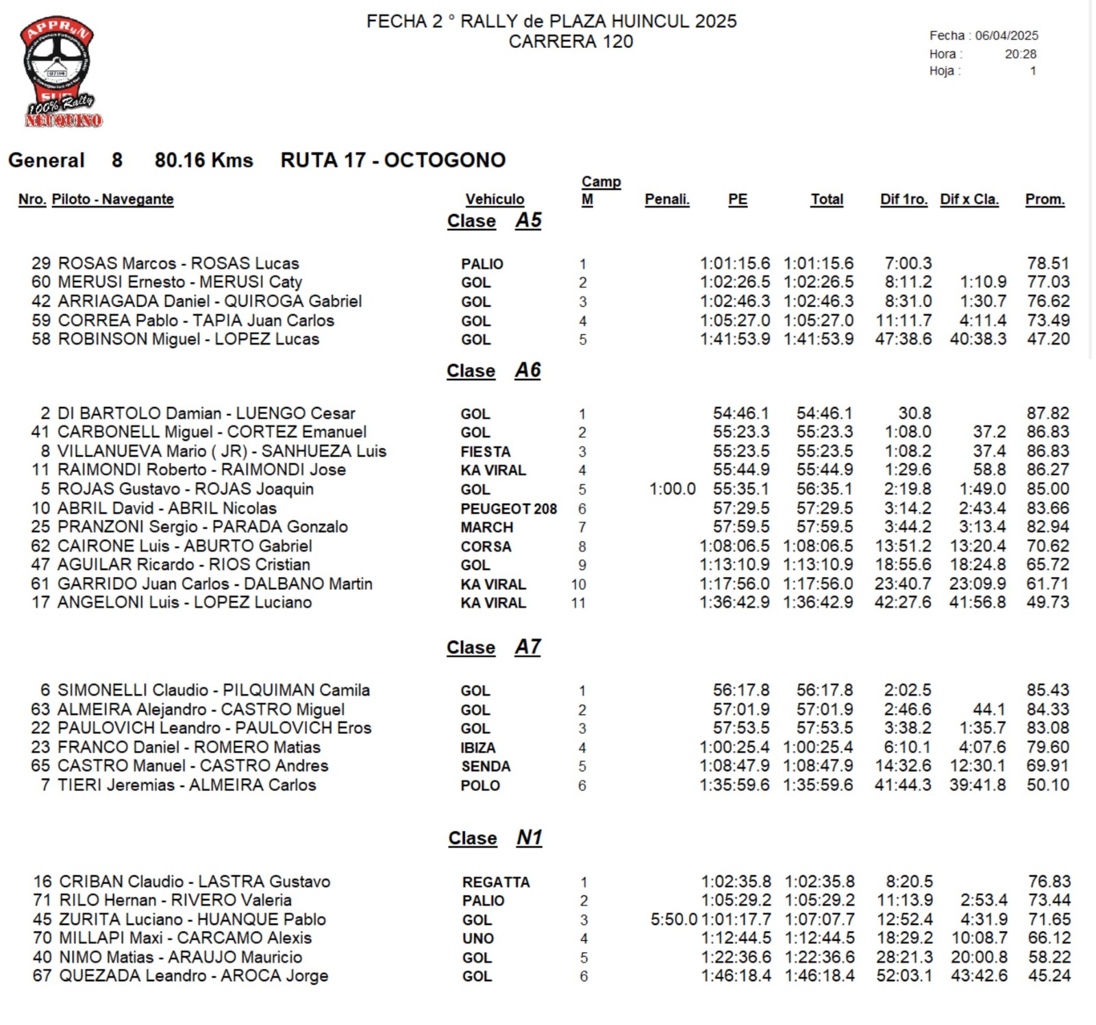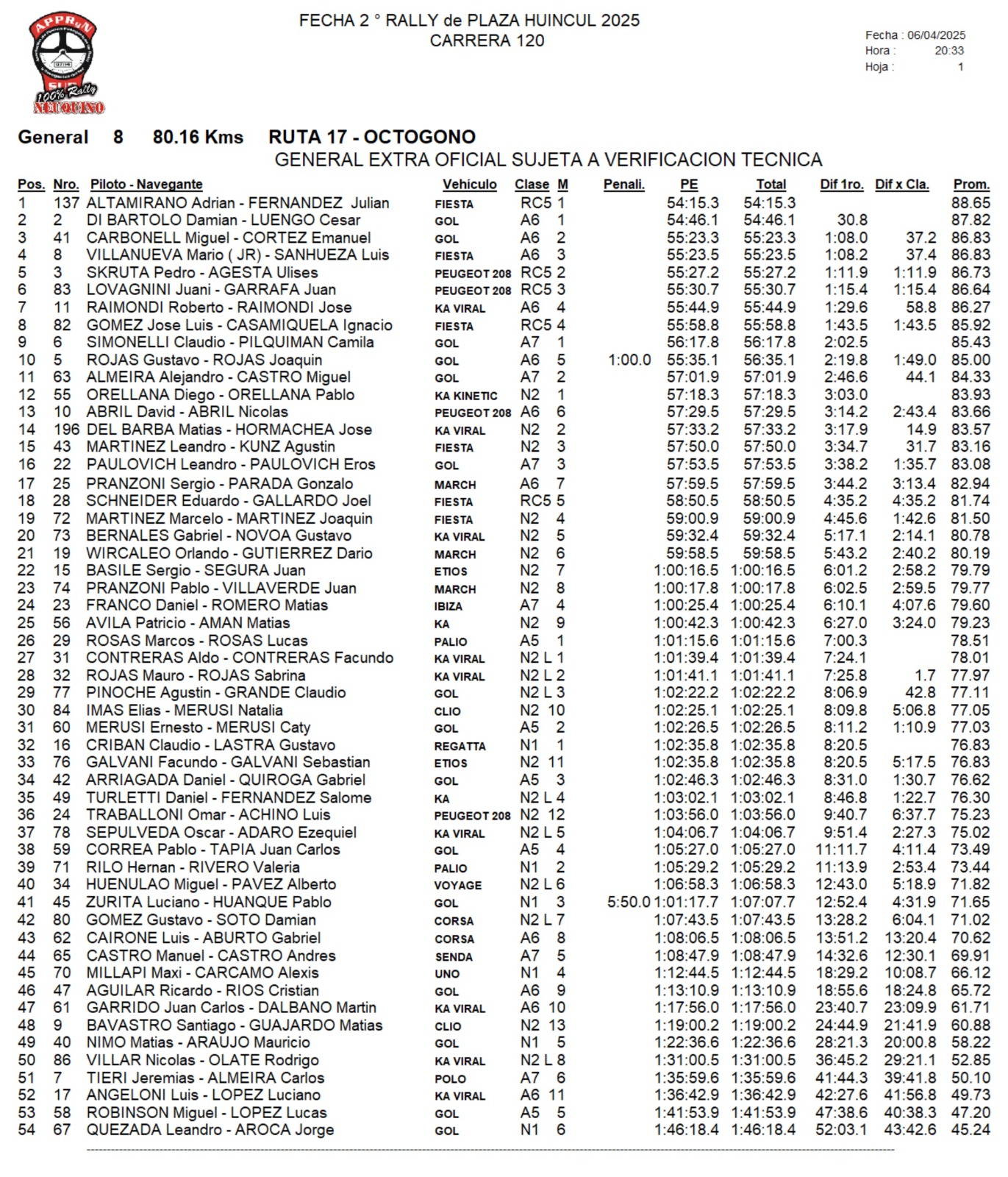 El Rally de Plaza Huincul válido por la segunda fecha del certamen neuquino reunió a casi ochenta binomios de Neuquén y Río Negro durante el fin de semana. Cerca de sesenta autos completaron la segunda etapa que se corrió este domingo y el de Zapala, Adrián Altamirano – Julián Fernández Igartua que había liderado la Clasificación General y la Clase RC5 ayer sábado, se mantuvo al frente en los tiempos y por poco más de 30 segundos se llevó el triunfo.