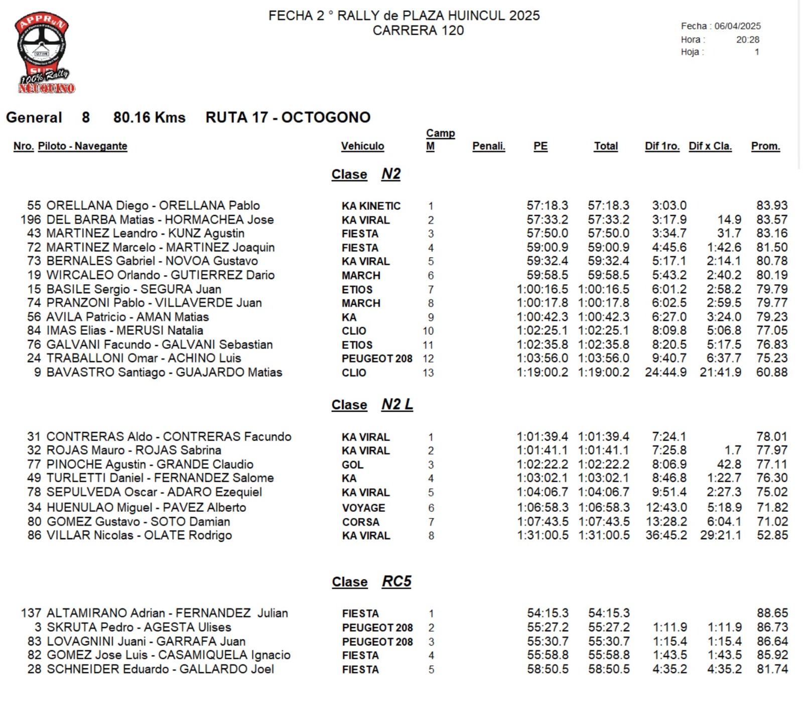 Más abajo se ubicaron Santiago Bavastro – Matías Guajardo, que ayer habían sufrido un vuelco con el Renault Clio. Puesto 48º en la Clasificación General para ellos y puesto 13º en la Clase N2. Por su parte Miguel González – Carlos López tuvieron su debut absoluto, dando la vuelta con su Volkswagen Gol y ocupando el puesto 53º de la General y un más que merecido quinto lugar en la Clase A5.