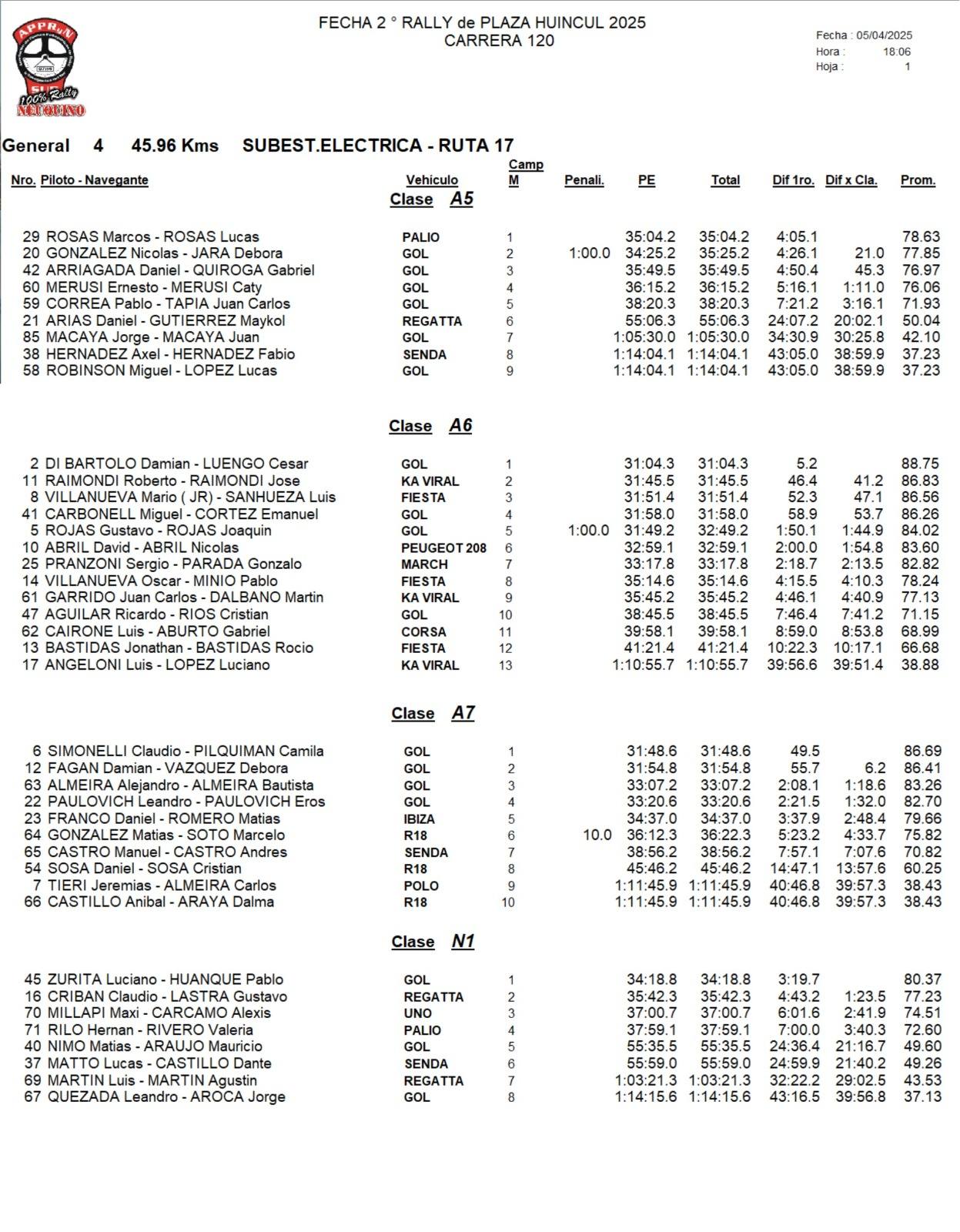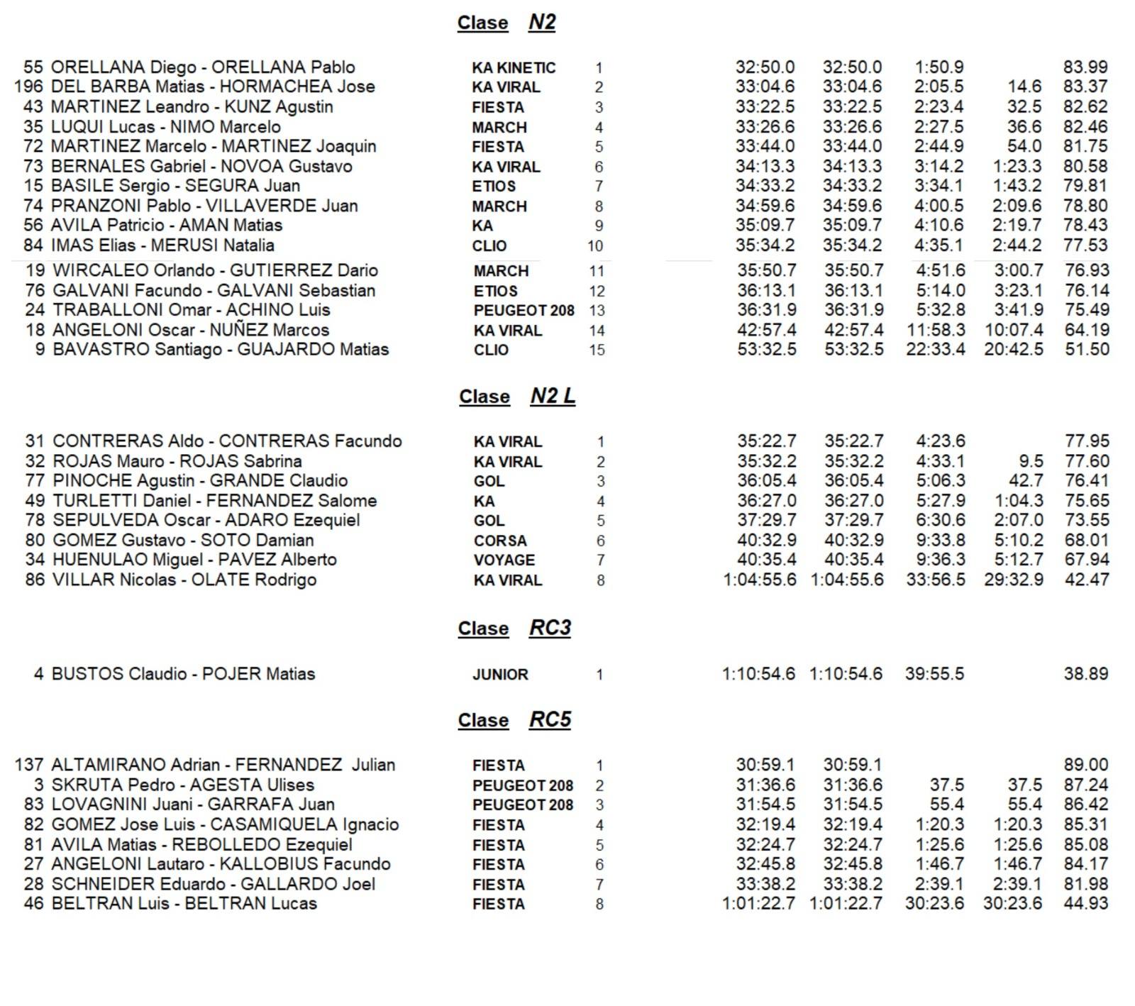 El repaso de los resultados de los binomios de Bariloche se completa con el puesto 58º en la General y 15º en la Clase N2 para Santiago Bavastro – Matías Guajardo con el Renault Clio, 61º para Lucas Matto – Dante Castillo con el VW Senda, que se ubica sexto en la N1 y puesto 71º en la General y novenos en la Clase A5 para Miguel González – Carlos López, que tuvieron su debut absoluto en el certamen, con el Volkswagen Gol con el que “El Salvaje” Zimmermann corrió de gran manera en el Rally de Bariloche el año pasado.