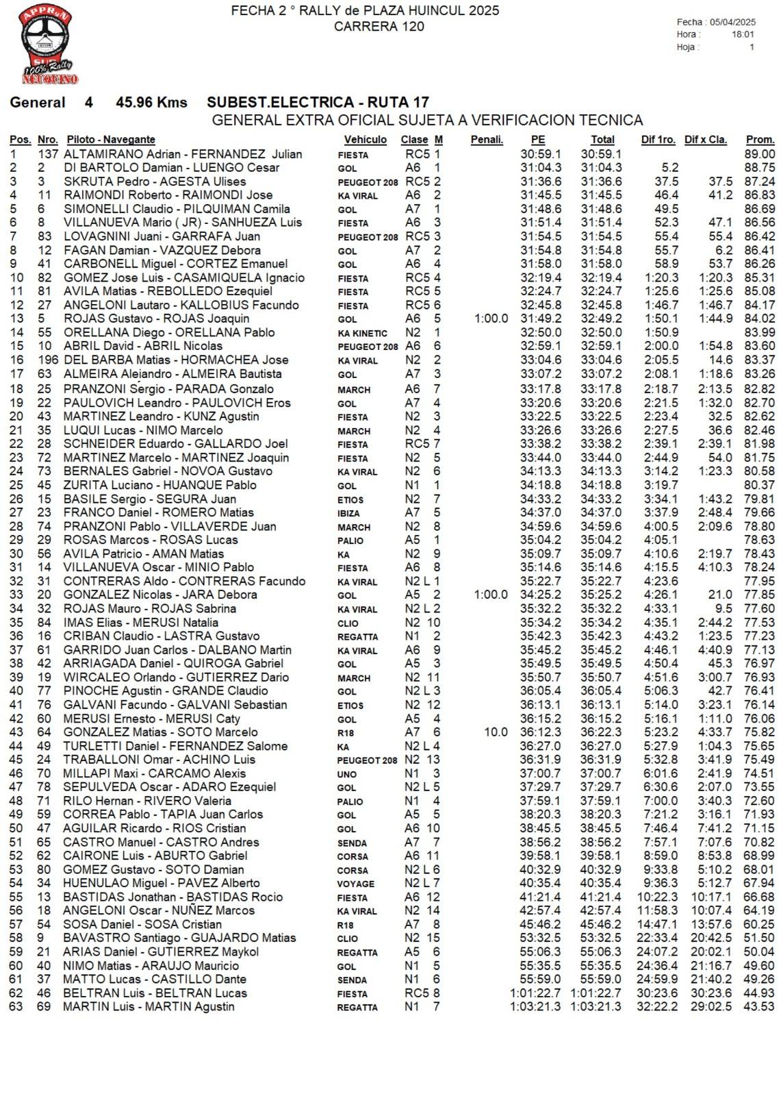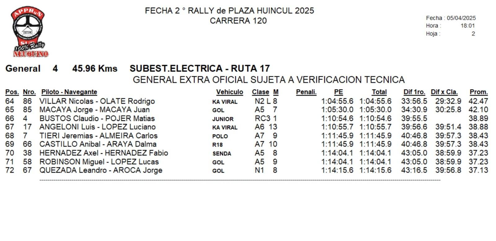 RESULTADOS – ETAPA 1 – RALLY DE PLAZA HUINCUL – 2º FECHA DEL CAMPEONATO NEUQUINO