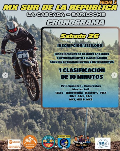 Después de ausentarse en el calendario en las últimas dos temporadas, el reconocido circuito La Cascada de Bariloche vuelve a tener un fin de semana de carreras y por los puntos de un certamen. Será este 26 y 27 de abril con la segunda fecha del Campeonato de Motocross del Sur de la República, campeonato que comenzó el mes pasado en el Manzano Brujo de San Martín de los Andes con más de cien pilotos.
