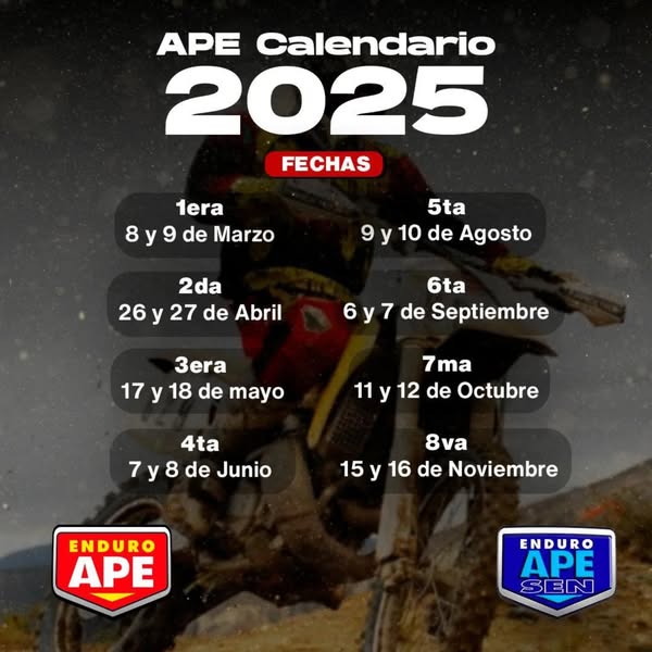 Públicamente, cuatro o cinco días después que el Enduro Cordillerano anunciara su calendario 2025 en sus redes sociales, el Enduro APE también informó en sus redes cómo será la temporada de este año y en algunos fines de semanas, ambos campeonatos coinciden. El inicio será el 8 y 9 de marzo con la primera fecha, la segunda el 26 y 27 de Abril y la tercera el 17 y 18 de mayo.