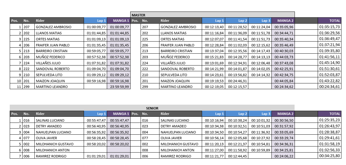 Pasando en limpio entonces y recordando que este campeonato tiene la modalidad de correr dos mangas de competencia, al estilo motocross y sumar los resultados de ambas carreras para tener la Clasificación General final, Luciano Salinas de Villa la Angostura triunfó en Senior, una categoría que tuvo varios pilotos que no son habituales de este certamen, pero que se sumaron y aportaron gran nivel al evento. El también angosturense Amadeo Detry terminó segundo, el barilochense Luciano Nahuelpan fue tercero, Javier Oliva, también de Bariloche culminó cuarto y el bolsonense Gustavo Milohanich quinto.