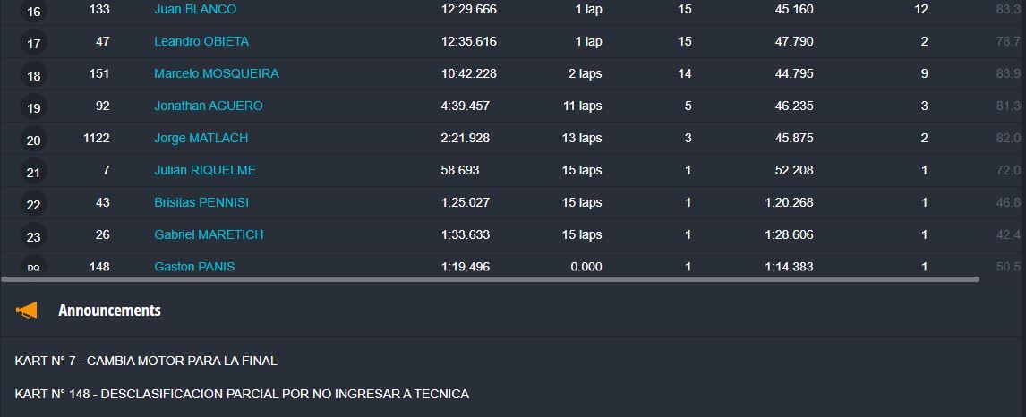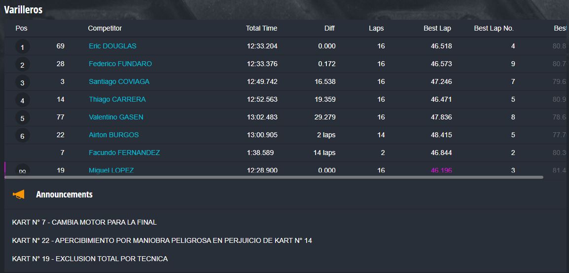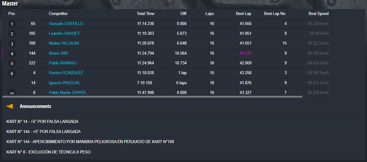 En la final de Súper Sudam Master, con buena diferencia, ganó Gonzalo Castillo, mientras que Manuel Scoli triunfó en Light 150, la divisional más numerosa, con 34 pilotos y Sami Mendaña hizo lo propio en 150 Pista, que también sumó muchos kartings, ya que fueron 24 clasificados. El resto de los ganadores fueron: Ciro Suarez en Junior 150, Tomás Bruno en Junior 125, Eric Douglas en Varilleros, Mateo Álvarez en Promocional y Santino D´annunzio en Escuelita.