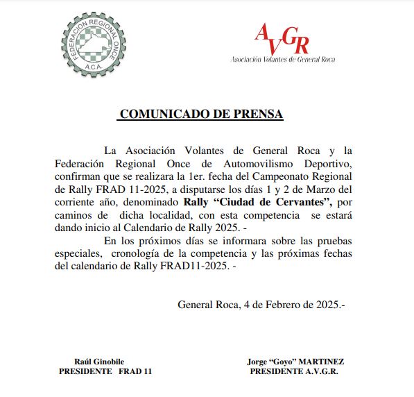 Así lo informó este martes la Asociación de Volantes de General Roca al confirmar que el 1 y 2 de marzo se disputará la primera fecha de la temporada 2025 por caminos de esa localidad.