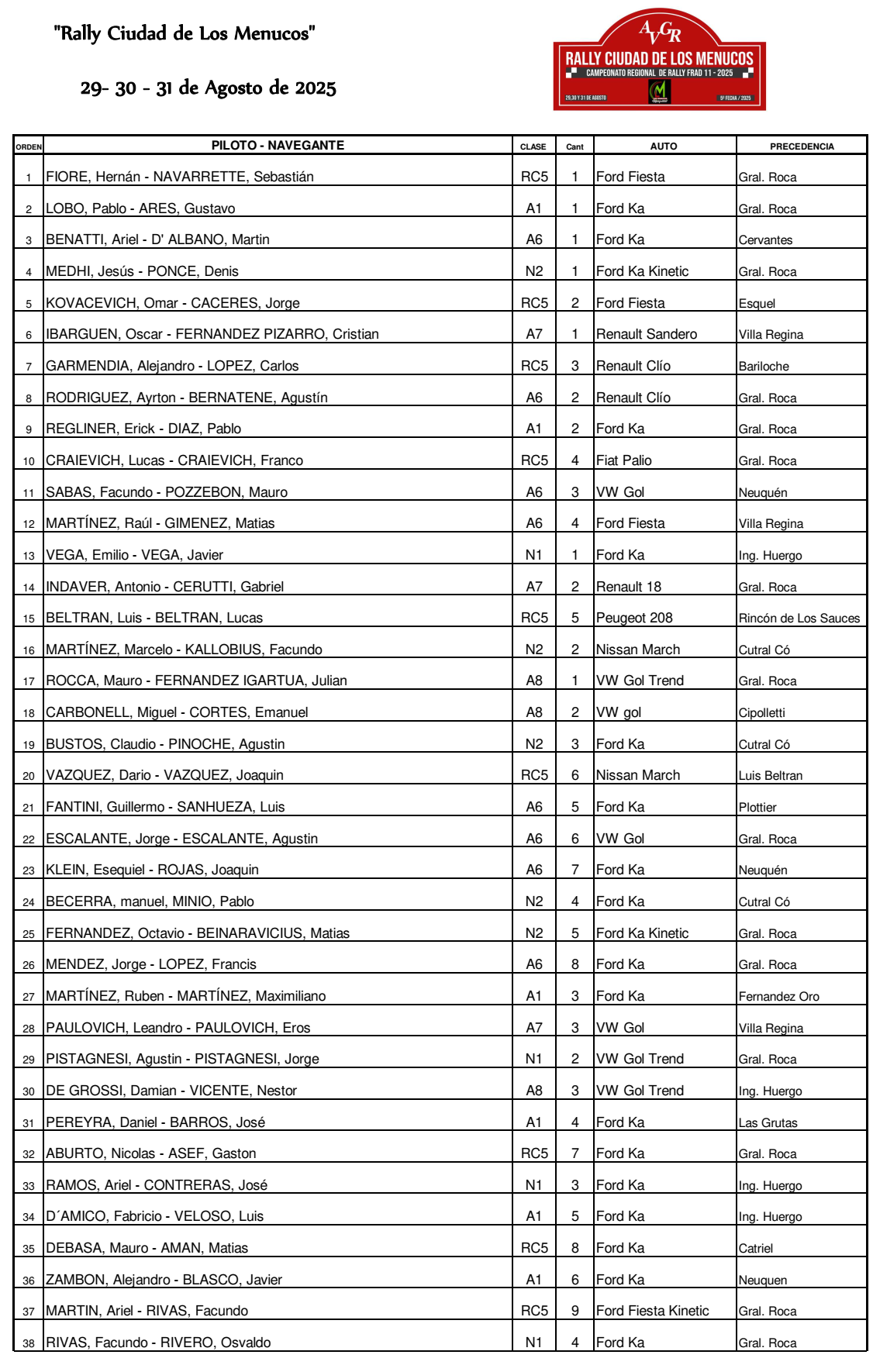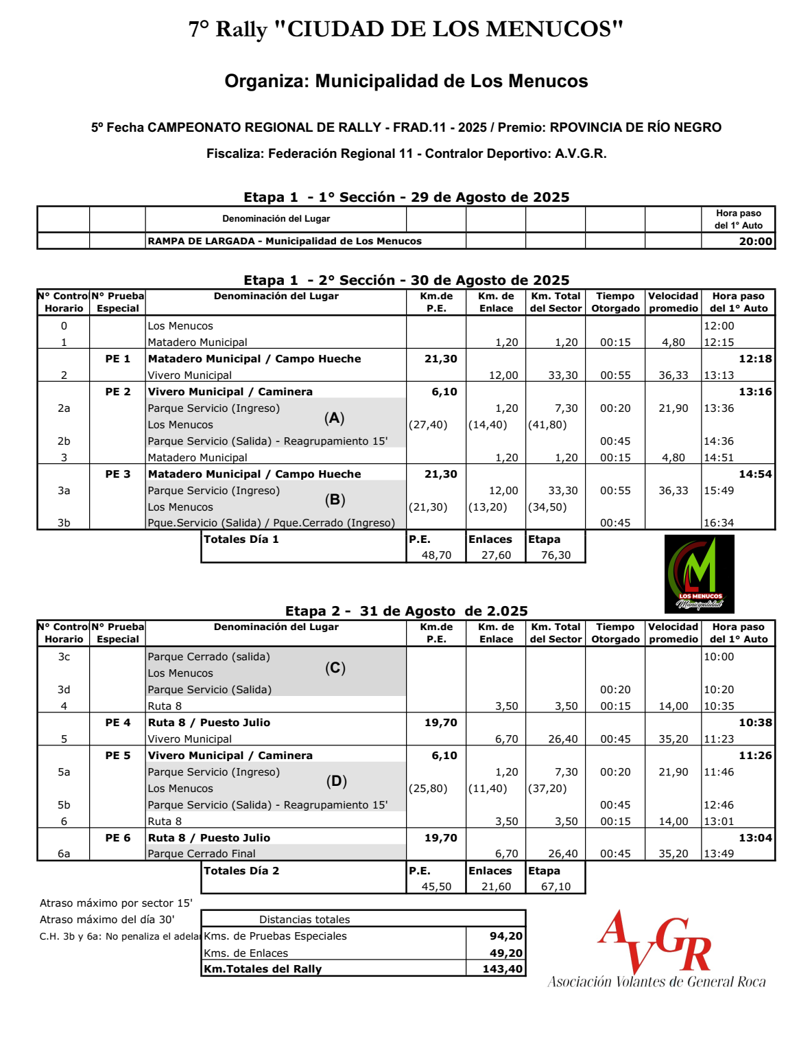 Este viernes 29 de agosto con las verificaciones técnicas y administrativas, el reconocimiento de caminos y la tradicional Rampa de Largada Simbólica, que se realizará a las 20 horas, frente a la Municipalidad de Los Menucos, en las calles Buenos Aires y Santiago del Estero, se comenzará a desarrollar la quinta fecha del Rally Regional en esa localidad de la Línea Sur, distante a unos 350 kilómetros de nuestra ciudad.