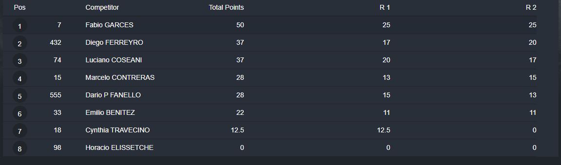 En la Master C, el barilochense Favio Garcés estuvo a un solo punto de ser campeón. Ganó las dos mangas puntuables del domingo y sumó 50 unidades para el campeonato, pero el puntero del certamen Diego Ferreyro terminó segundo en la sumatoria de puntos de la sexta fecha y se coronó con 222 puntos, mientras que Garcés fue subcampeón con 221 unidades.