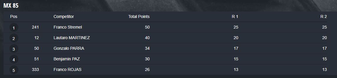 En MX 85cc. al pequeño barilochense Lautaro Martínez, el campeonato se le escapó por solo ocho puntos, en un año brillante para él, con un gran crecimiento y destacada asistencia, no solo en el MX del Sur, sino que también fue parte del Campeonato Argentino de motocross, cuando se corrió en Cipolletti, en el estreno del nuevo circuito Otto Race Track.