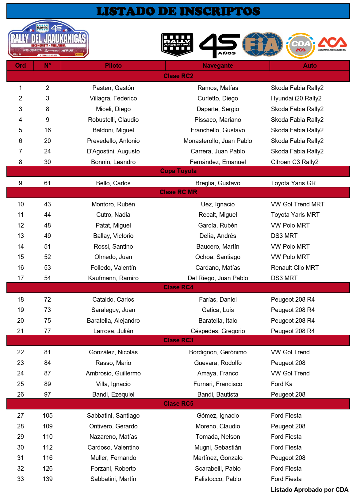 El Rally del Jaaukanigás, que se disputará del 1 al 3 de agosto con sede en Reconquista y Avellaneda, ya cuenta con su listado oficial de inscriptos para la sexta fecha del campeonato de Argentino.