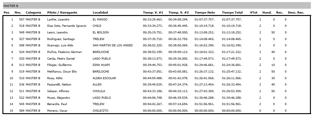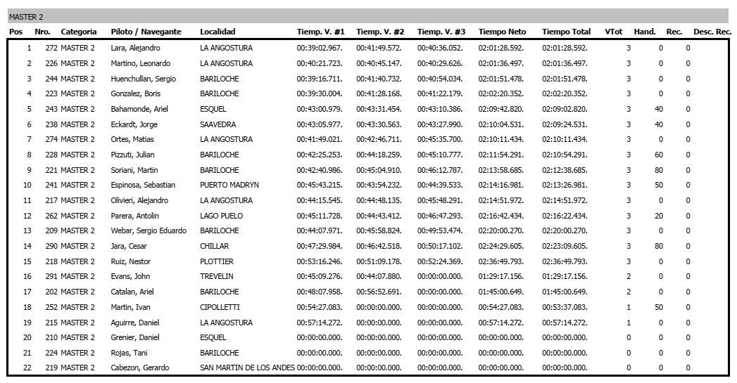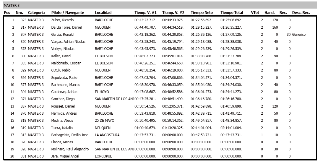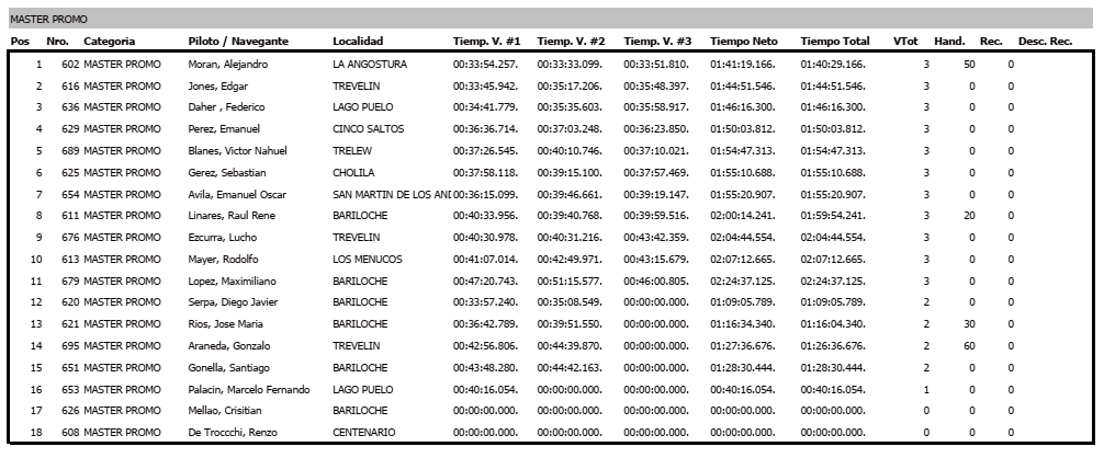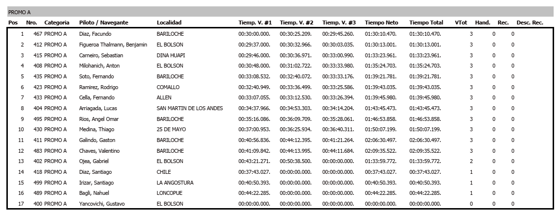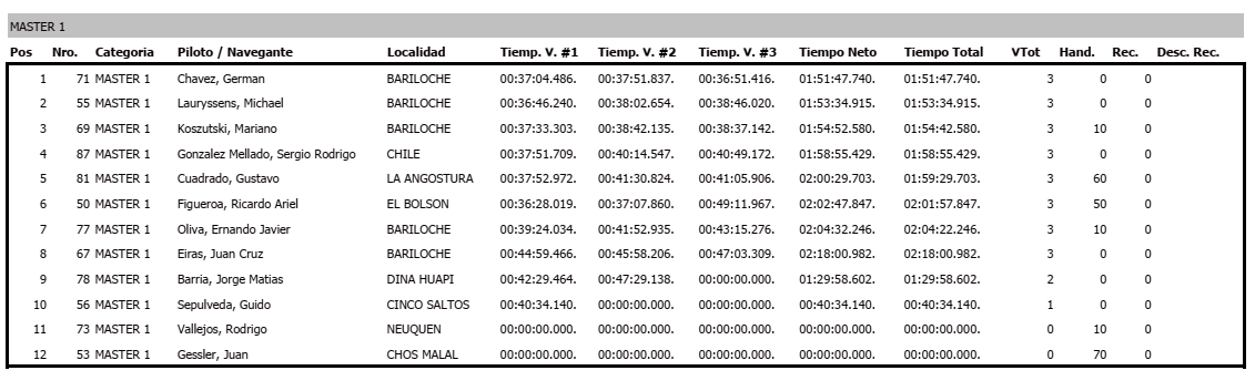 Con gran presencia barilochense como de costumbre, que repasaremos al detalle luego, hubo protagonismo local en la mayoría de los podios, con varios triunfos además del de Luzzardi. Manuel Maier de Bariloche ganó en Junior, Germán Chávez, también de nuestra ciudad hizo lo propio en Master 1, Alejandro Lara de Villa la Angostura en Master 2, Ricardo Zuber de Bariloche en Master 3, Lisandro Lanfre de El Manso en Master B, Alejandro Moran de Villa la Angostura en Master Promo, Facundo Díaz de Bariloche en Promo A y Joaquín Araneda de Chile en Promo B, completando así todos los ganadores de la fecha.