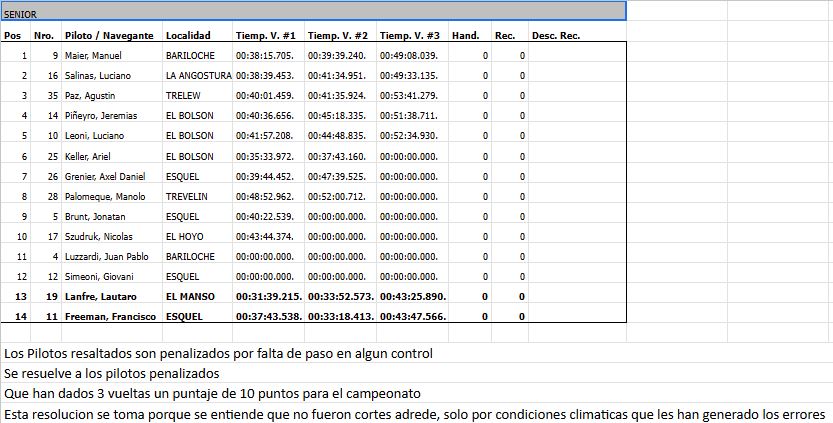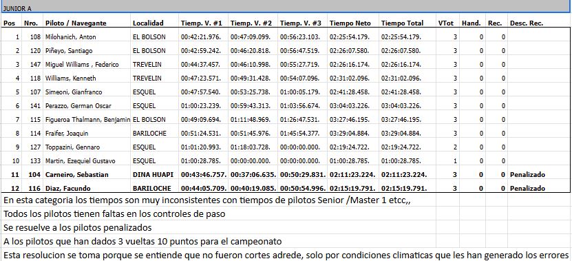 Por diferentes penalizaciones a los pilotos que en carrera habían terminado más adelante, los podios y las principales posiciones de las categorías Senior, Junior A y B y Master 1, 2 y 3, de la primera fecha del Enduro Cordillerano que se corrió el pasado fin de semana en Corcovado, tuvieron modificaciones en la mayoría de las divisionales.