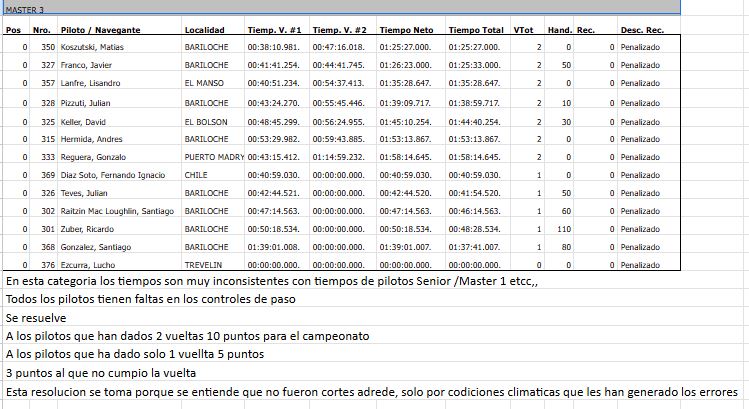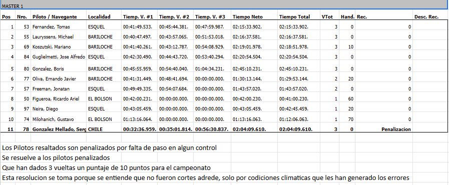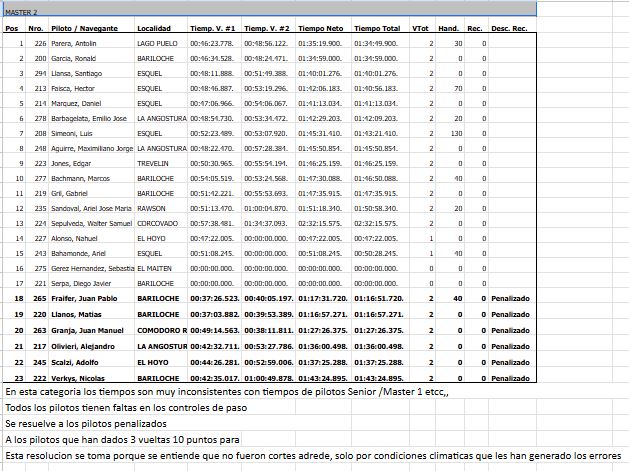 En la Master 1 también hubo importantes modificaciones, el chileno Sergio González Mellado que figuraba primero en los resultados parciales fue penalizado y terminó último, por lo que el esquelense Tomás Fernández “heredó” el primer lugar y ganó la categoría. En Master 2 seis pilotos fueron penalizados, varios de ellos que habían terminado más adelante, el ganador finalmente fue Antolín Parera de Lago Puelo, en tanto que en la Master 3 todos los pilotos fueron penalizados y no hubo posicionamientos, por insconsistencias en los tiempos y se le otorgaron diez puntos para el campeonato a los que dieron dos vueltas y cinco a los que hicieron una, entendiendo que los cortes de camino no fueron adrede.