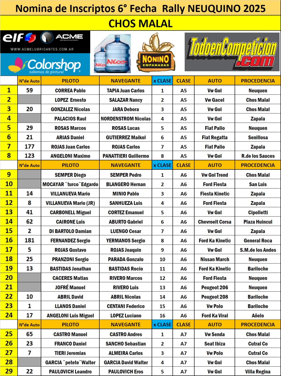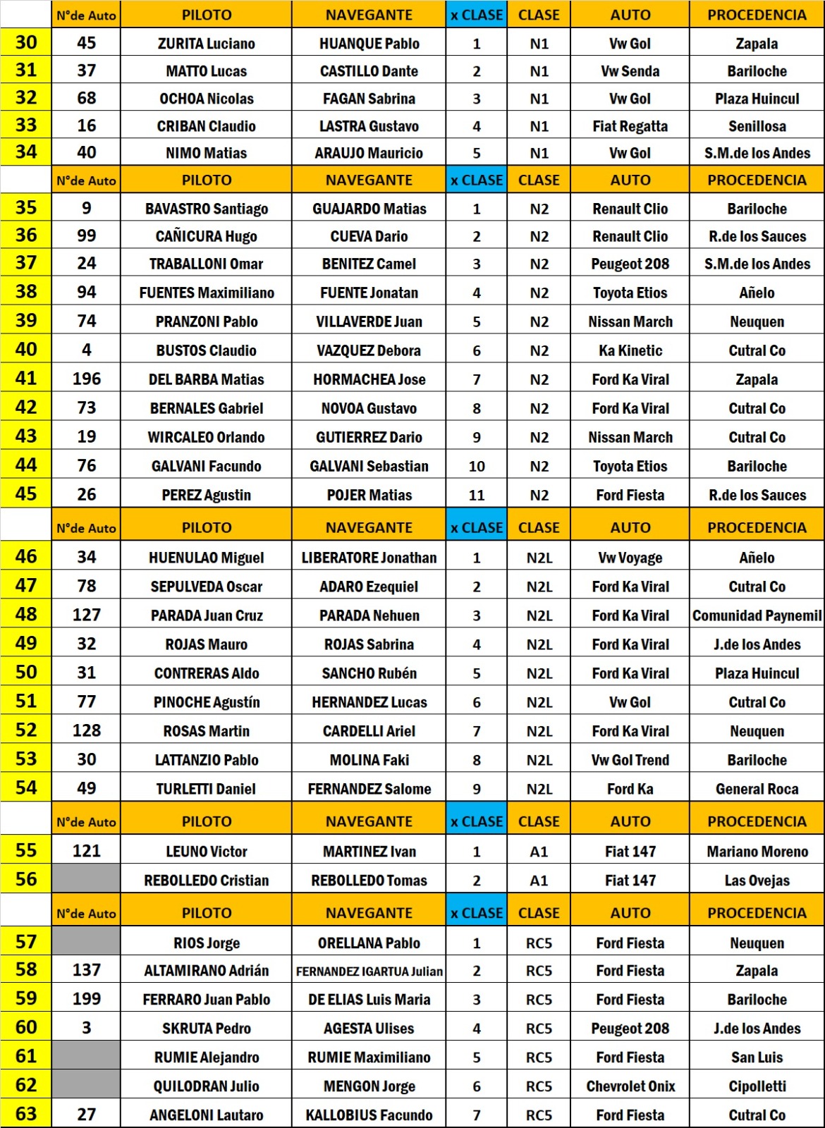 De Bariloche estarán: Jonathan y Rocío Bastidas con el Ford Ka Kinetic, David y Nicolás Abril con el Peugeot 208 y Daniel Llanos – Federico Centani con el Volkswagen Polo, los tres en la Clase A6, mientras que Lucas Matto – Dante Castillo con el Volkswagen Senda en la N1, Santiago Bavastro – Matías Guajardo con el Renault Clio y Facundo y Sebastián Galvani con el Toyota Etios en la Clase N2.