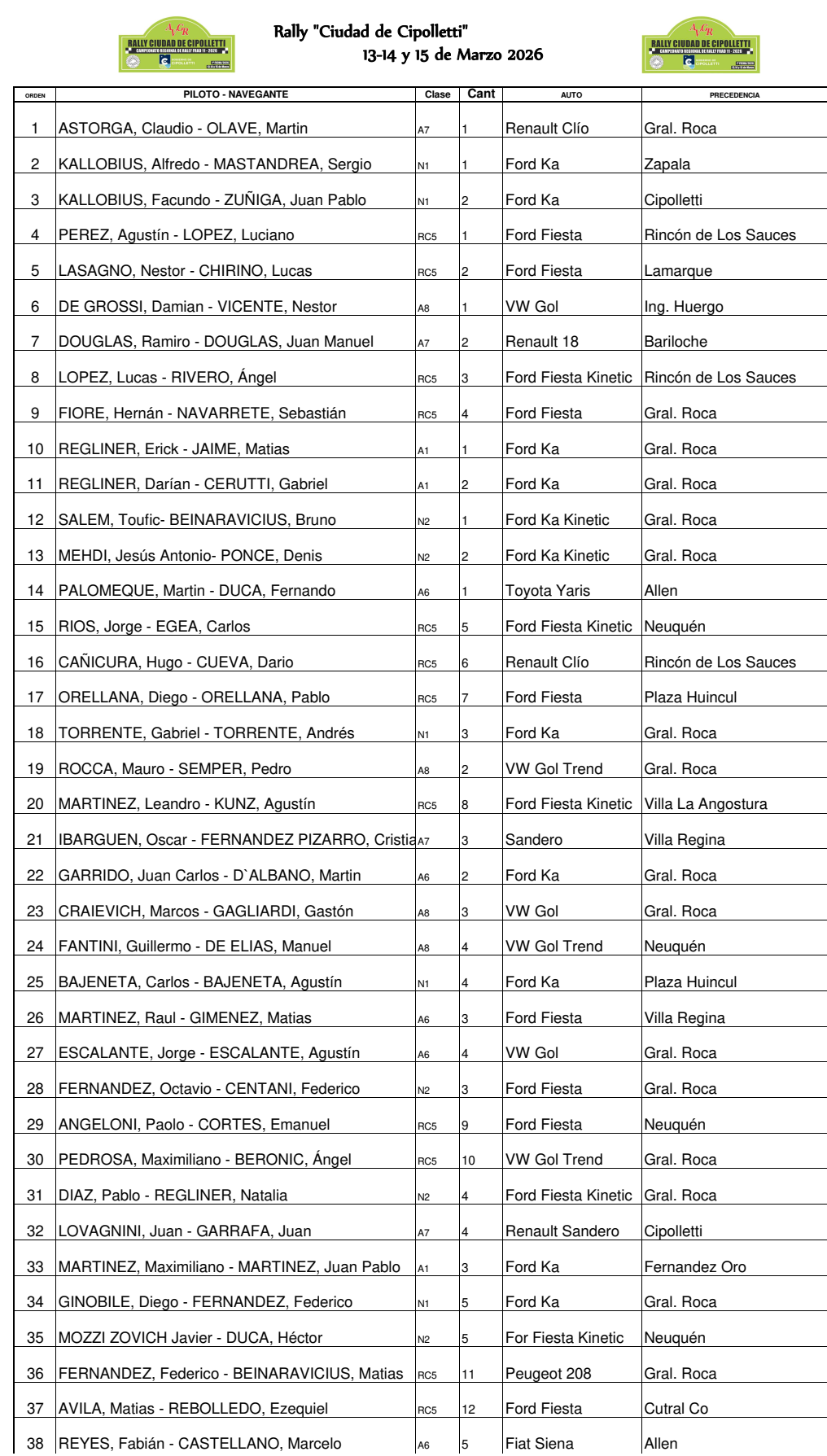 Con un buen parque motor, si analizamos las últimas presentaciones del Rally Regional en la zona de El Valle, ayer miércoles se cerró el registro de inscripciones para la primera fecha del Campeonato 2026 organizado por la Asociación de Volantes de General Roca y fiscalizado por la Federación Regional 11, con un total de 68 binomios.